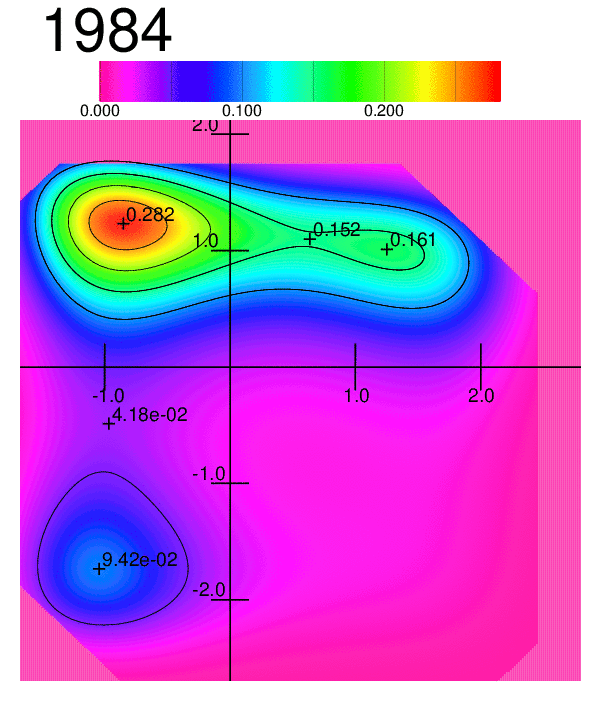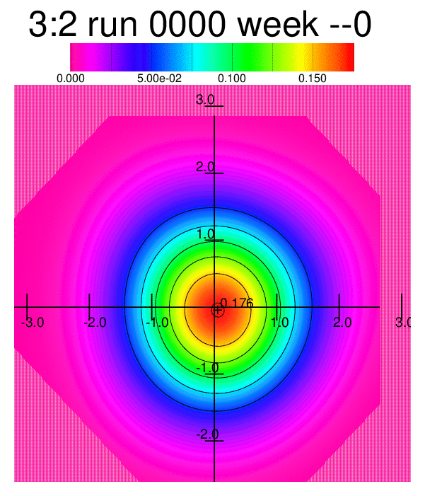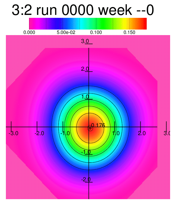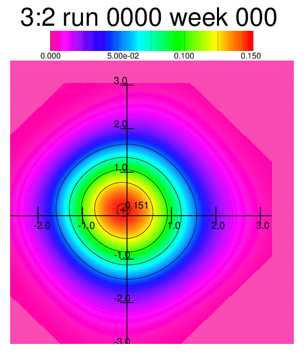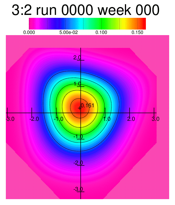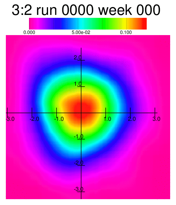 Whereas the animations above were processed with an algorithm approximating the simulated frequency distribution to a frequency distribution of the type exp(P(x,y;θ)) where P(x,y;θ) is a polynomial up to fourth degree, an animated heatmap shows more or less the same behaviour of the changing distribution: